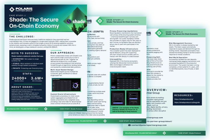 Polaris collaborated closely with Shadeʼs core team to chart a decentralized path for Silk. Together we defined the blueprint for a multi‑asset, privacy‑preserving stablecoin that can be minted through an algorithmic lending market and backed by collateralized debt positions.